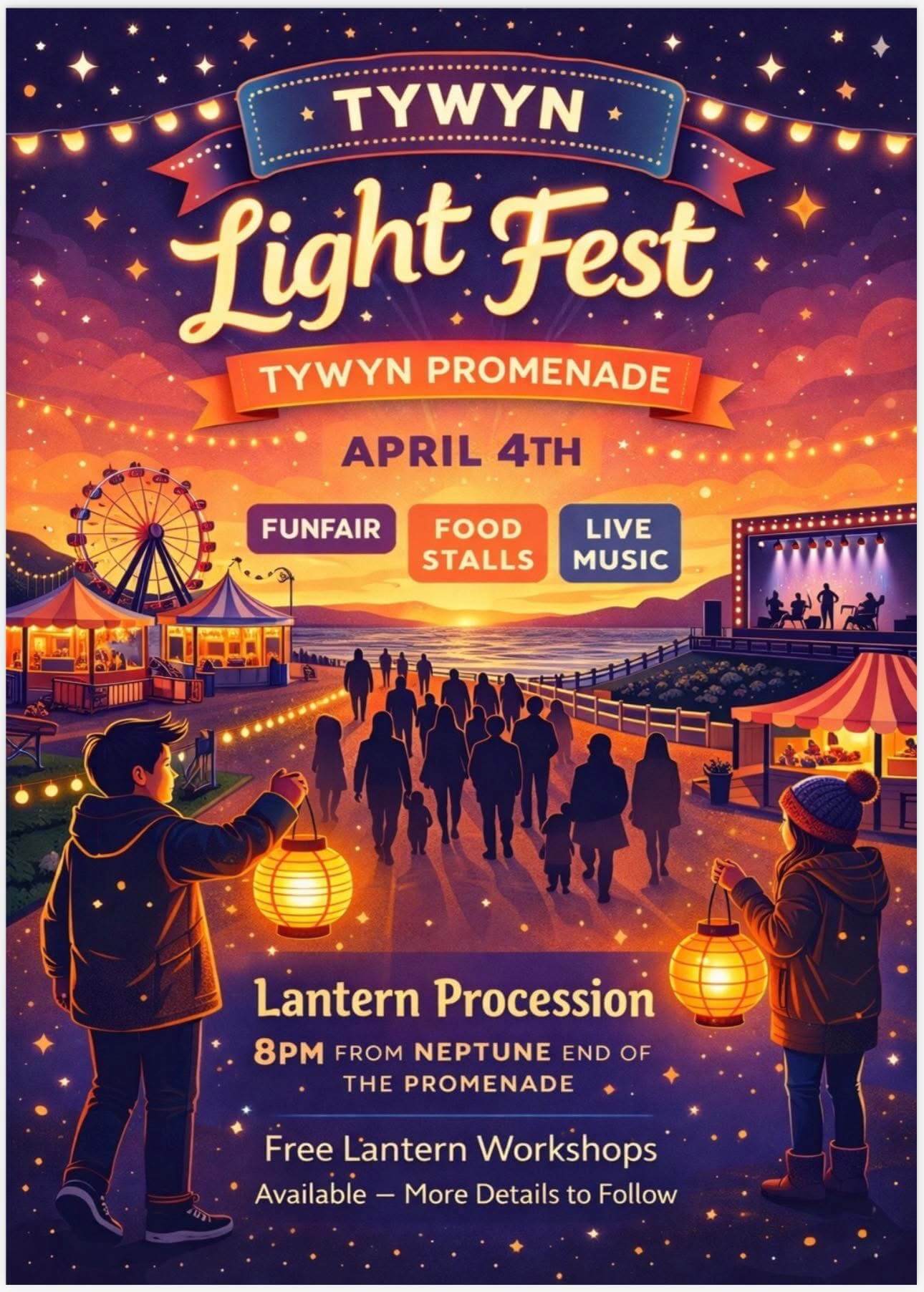 4 April – Tywyn Light Fest – 8pm lantern parade, live music, funfair and food stalls